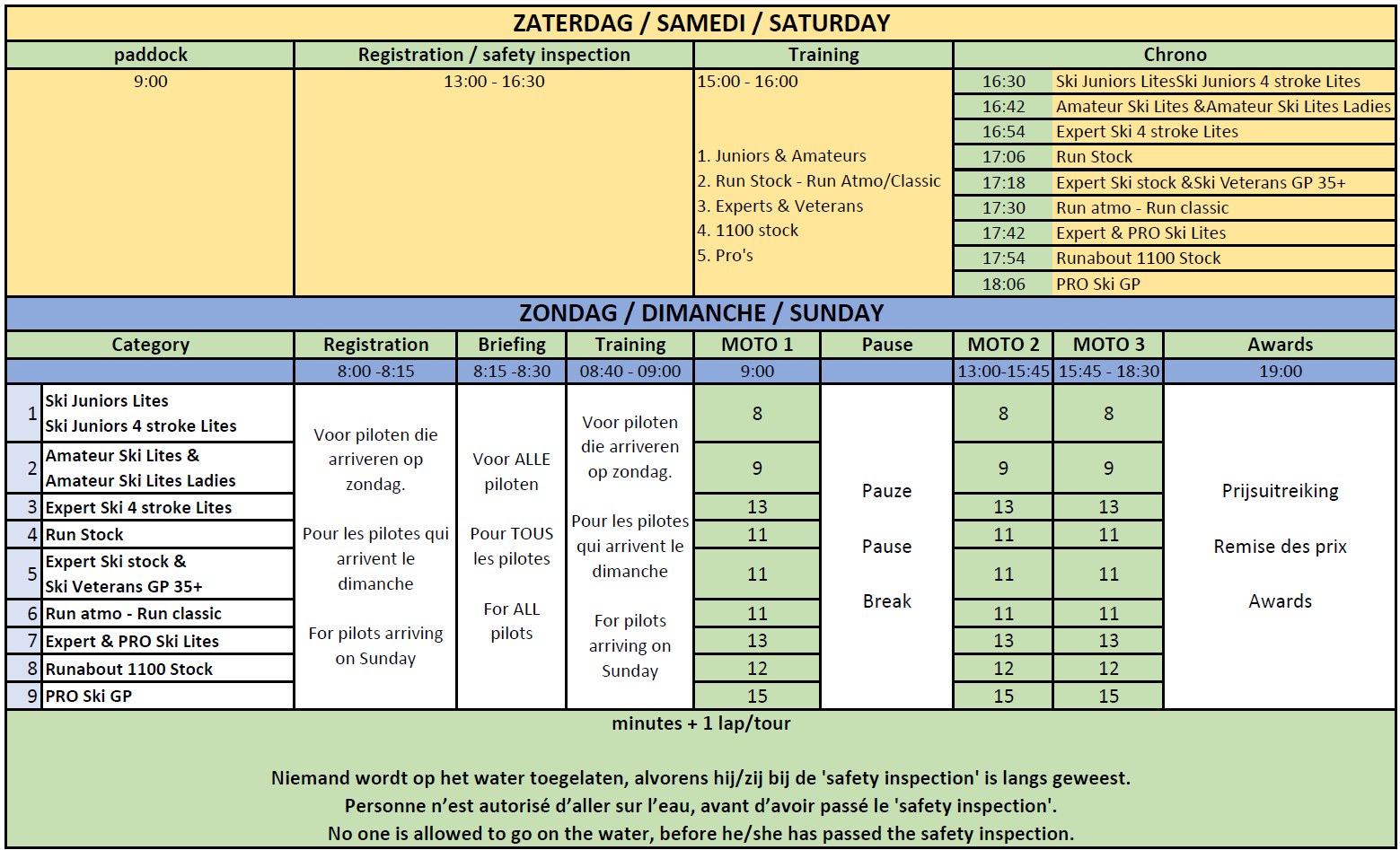 - Chrono-sessies van 16:30 tot 18:00: 12 minuten vrij water per categorie om de beste rondetijd neer te zetten. Deze tijd zal de startpositie bepalen voor de eerste manche op zondag.